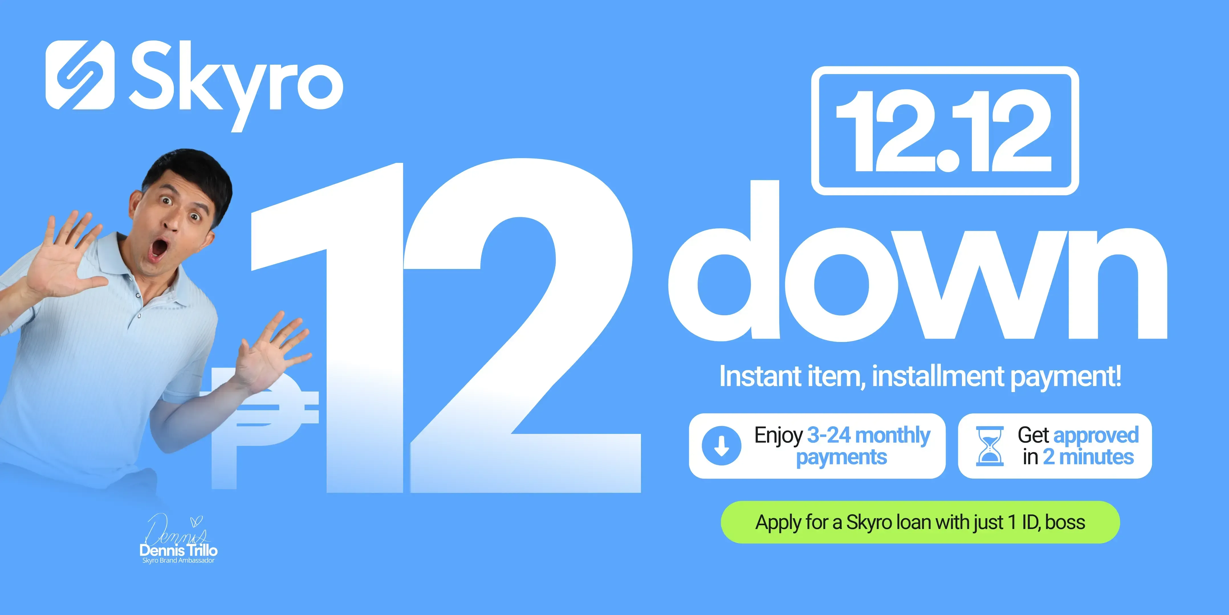 The ₱12 DOWN offer applies to selected products from Skyro partner stores, including gadgets, appliances, and other big-ticket items. Eligibility depends on the loan amount, product, and credit approval.