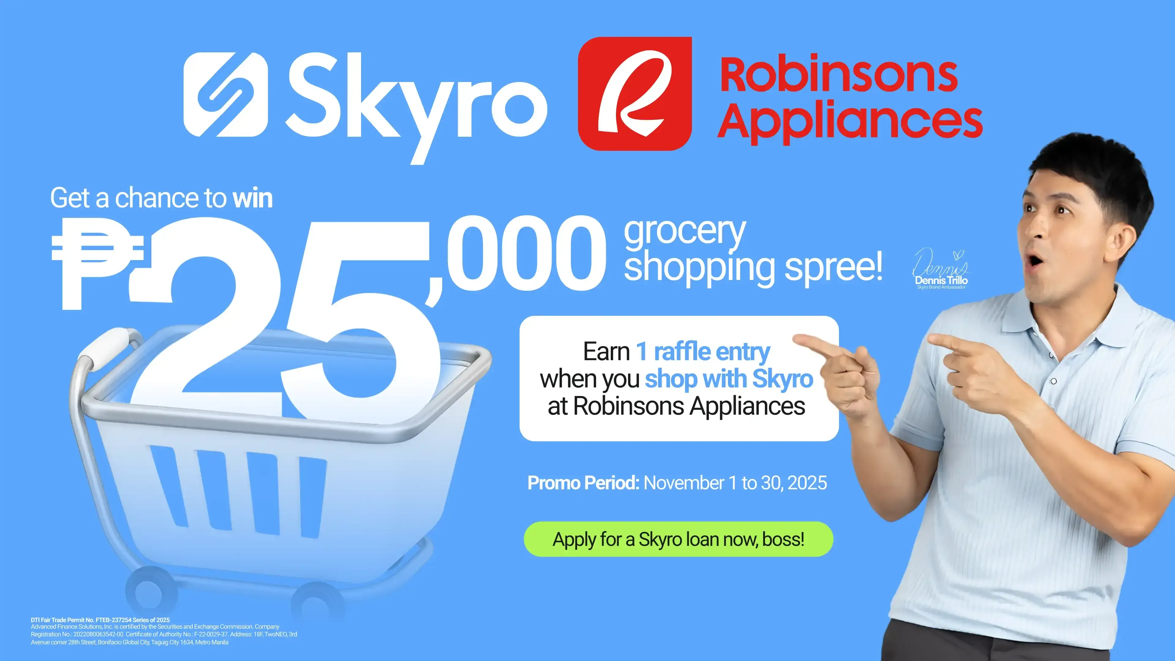 3. Customers will earn one (1) raffle entry for every successful product purchase financed via Skyro at any Robinsons Appliances store nationwide.