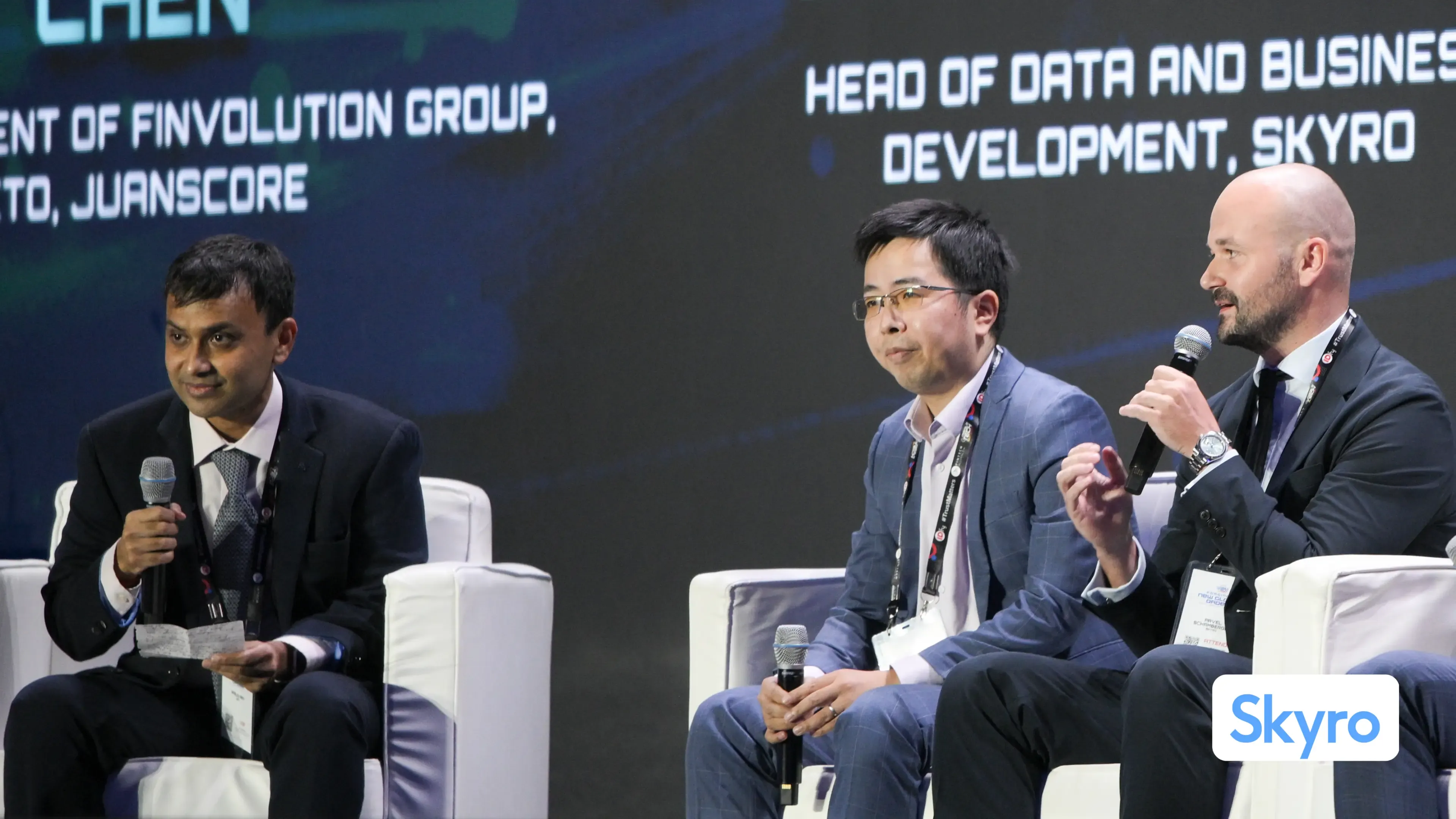 Skyro Head of Data and Business Development Pavel Schamberger (rightmost) and JuanScore Chief Technology Officer and FinVolution Group Vice President for Global Business Lei Chen (middle) together with panel moderator IDfy Chief Business Officer Wriju Ray (leftmost), discuss The Rise of AI-Powered Finance in Asia: Use Cases from Lending to Risk Scoring during the second day of the Manila Tech Summit 2025.