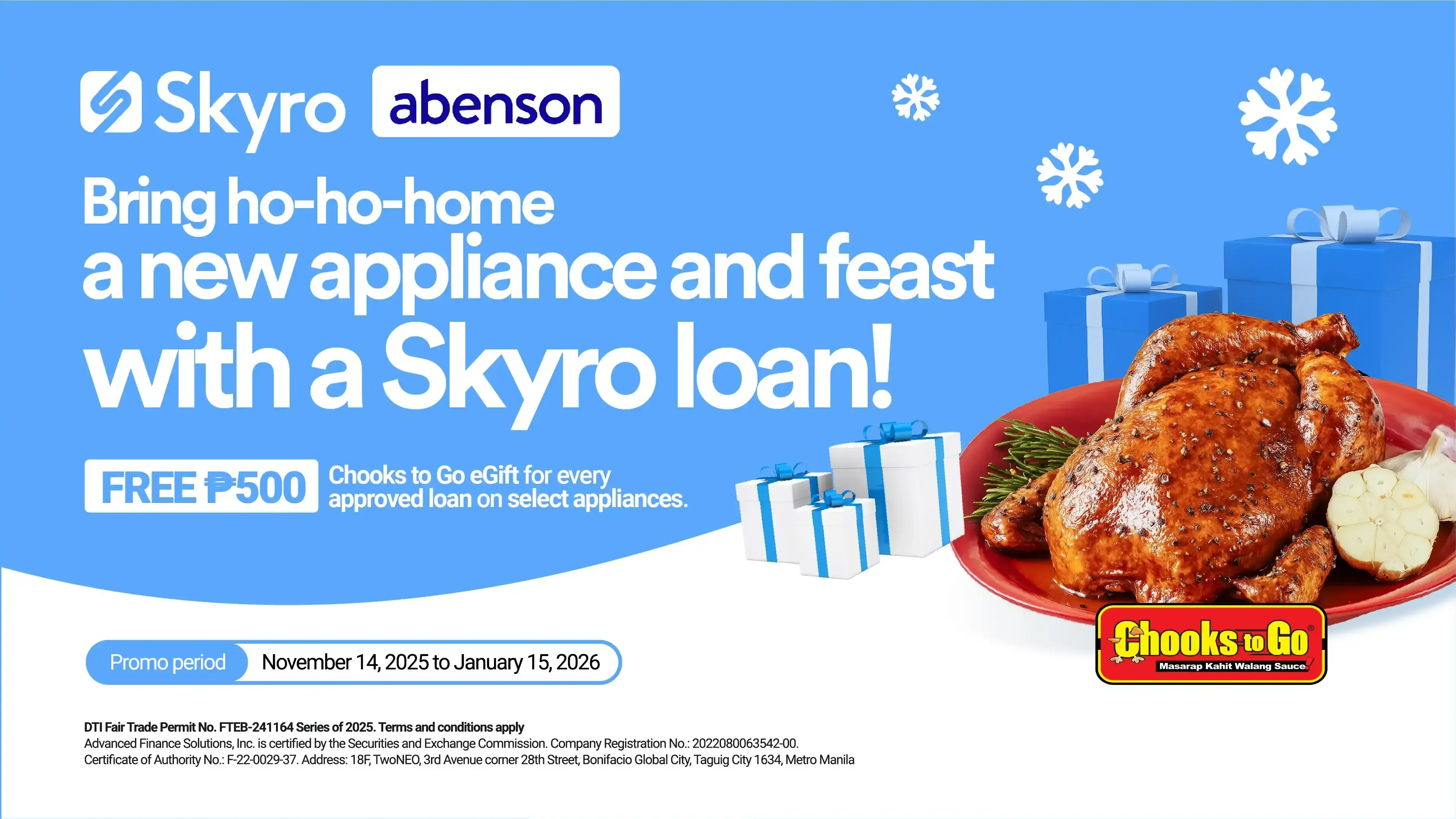 3. An eligible customer will get a free ₱500 Chooks to Go eGift upon successfully applying for a Skyro product loan on the following commodities at Abenson: